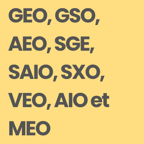 Depuis deux ans, le Search parle une nouvelle langue. Aux cĂŽtĂ©s de termes historiques, une constellation dâacronymes â GEO, GSO, AEO, SGE, SAIO, SXO, VEO, AIO, MEO â sâest imposĂ©e dans les Ă©changes entre Ă©quipes marketing, produits et data. Cette inflation de sigles nâest pas un effet de mode : elle traduit un basculement rĂ©el des moteurs de recherche vers des mĂ©canismes de comprĂ©hension sĂ©mantique et de gĂ©nĂ©ration de rĂ©ponses, oĂč lâintention, le contexte et les formats multimodaux pĂšsent plus lourd que la simple rĂ©pĂ©tition de mots-clĂ©s.